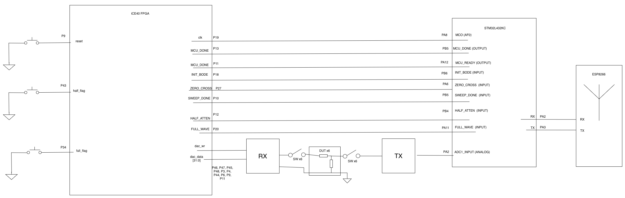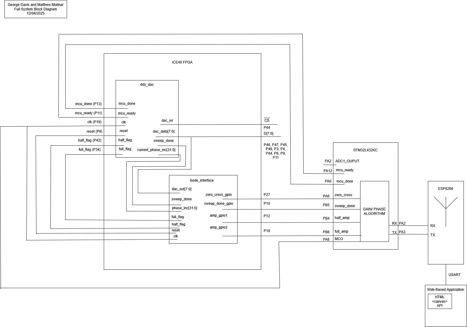 Our system is composed of an FPGA, an MCU, and an ESP8266. The FPGA is controlled by the MCU and is responsible for generating a sine wave frequency sweep from 100 Hz to 100 kHz. This frequency sweep drives an external DAC (AD5424), which outputs an analog signal that passes through a transmit chain, then a DUT (filter of choice), and through the receive chain. The MCU then uses its ADC peripheral to collect data throughout the frequency sweep in order to calculate the magnitude and phase responses as a result of the DUT. Finally, the MCU sends this data to an ESP8266 which hosts a webpage containing the bode plots that characterize the selected DUT.