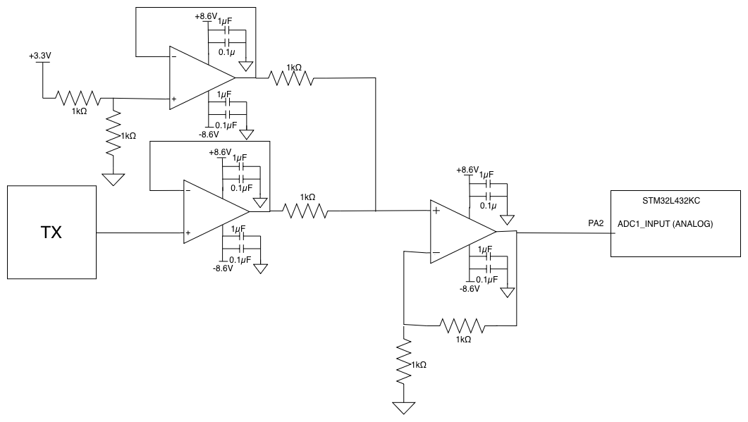 The RX chain needed to scale the received signal to the MCU input voltage range of 0 to 3.3V. We used a simple summing op amp with buffer to bring the wave from zero centered to the center of the input range.