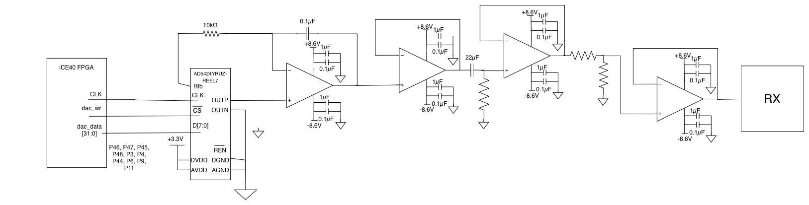 The TX chain or transmit chain place the analog DAC output on a zero centered wave between -1.65 and 1.65 volts. We were able to do this accurately with a coupling circuit and inverting amplifier with gain. To limit noise we added decoupling capacitors to all op-amp rails. After we implemented this we saw a significant increase in our signal to noise ratio at large attenuation. Unity gain buffers were used liberally to ensure buffered impedance between sections of the circuit.